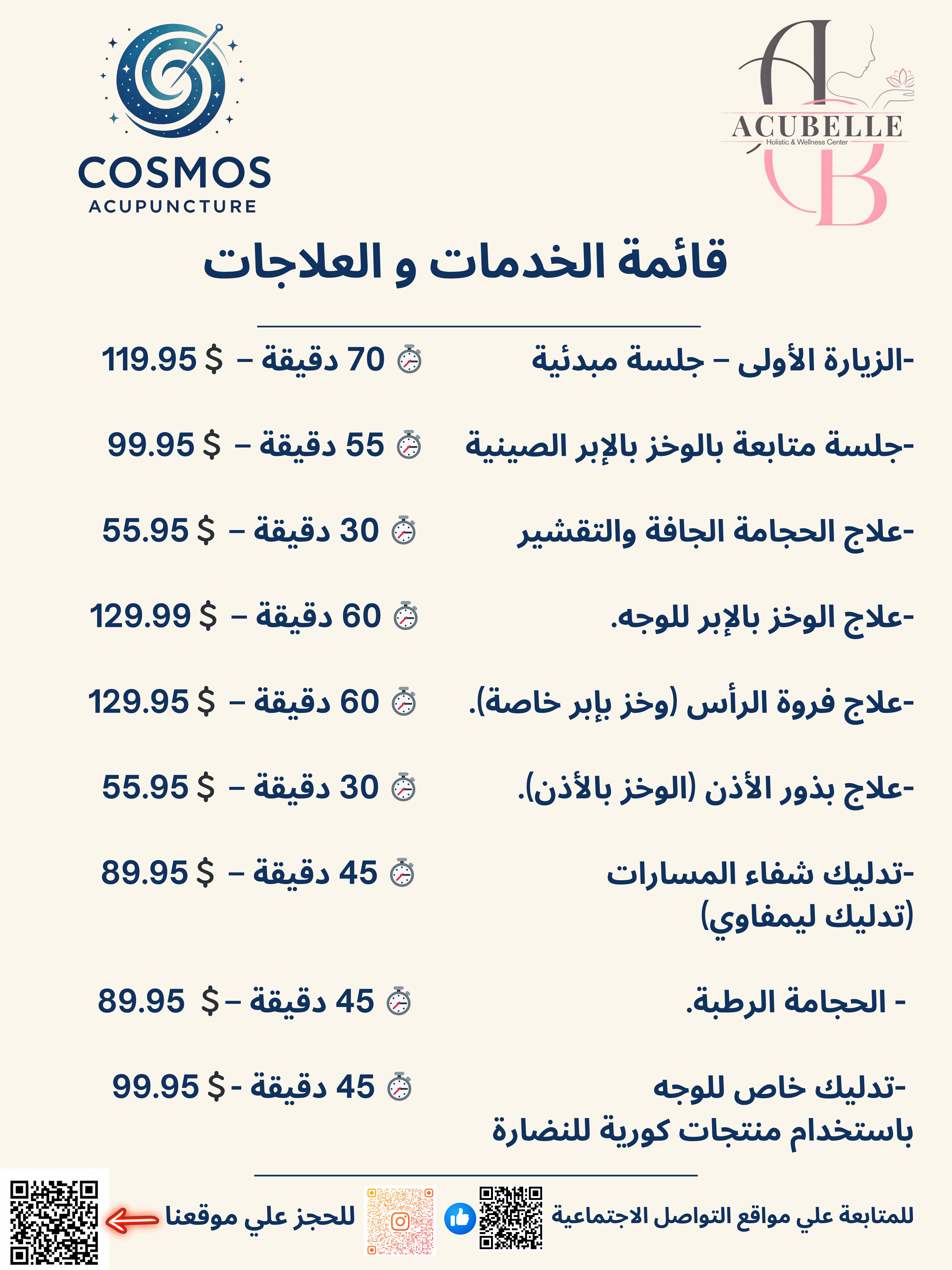 من الوخز بالإبر العلاجي و التجميلي إلى علاجات الجسم المجدّدة للنشاط، نقدم لك حلولًا مخصّصة لمساعدتك على تحقيق صحة متألقة وجمال طبيعي